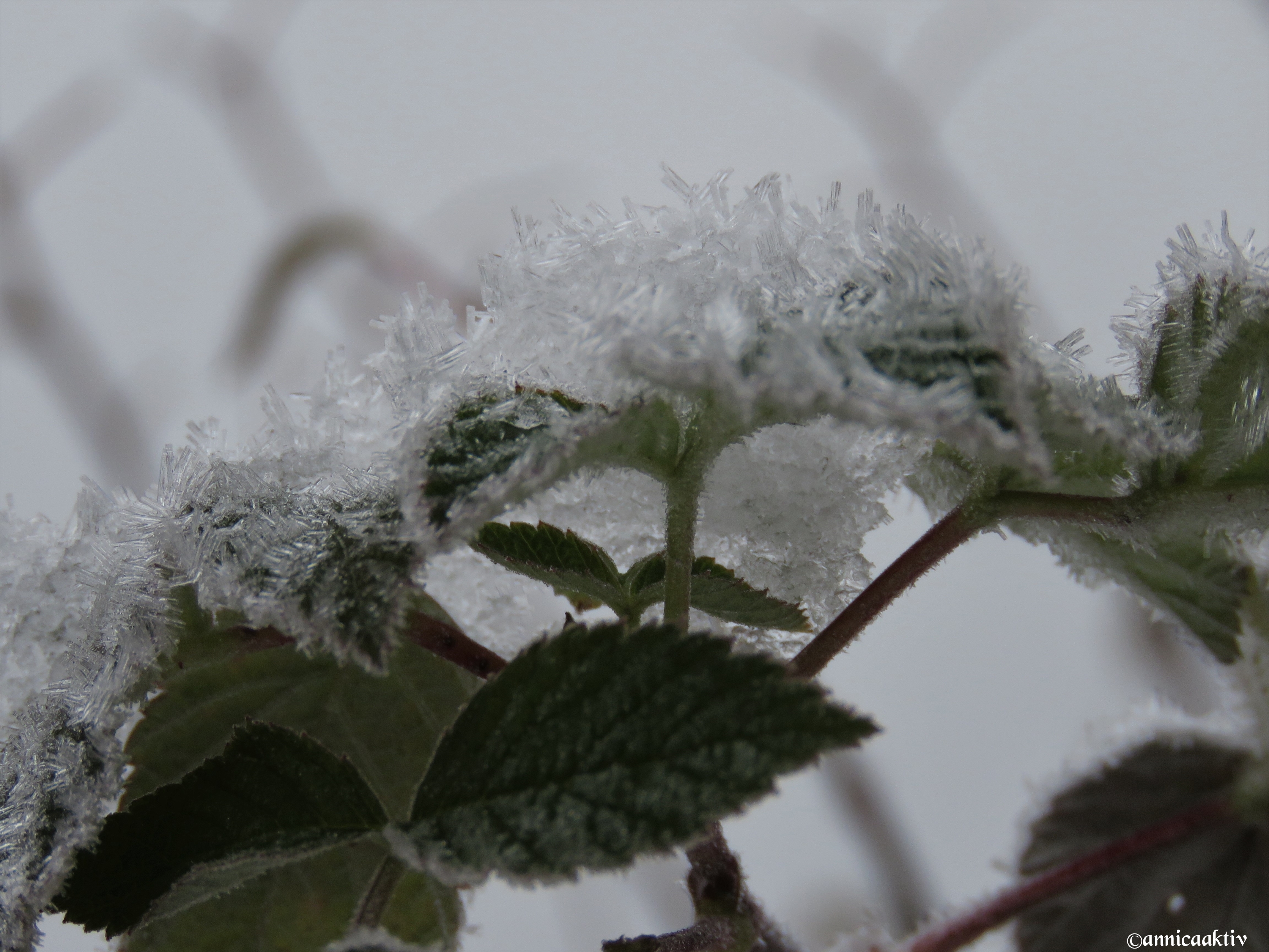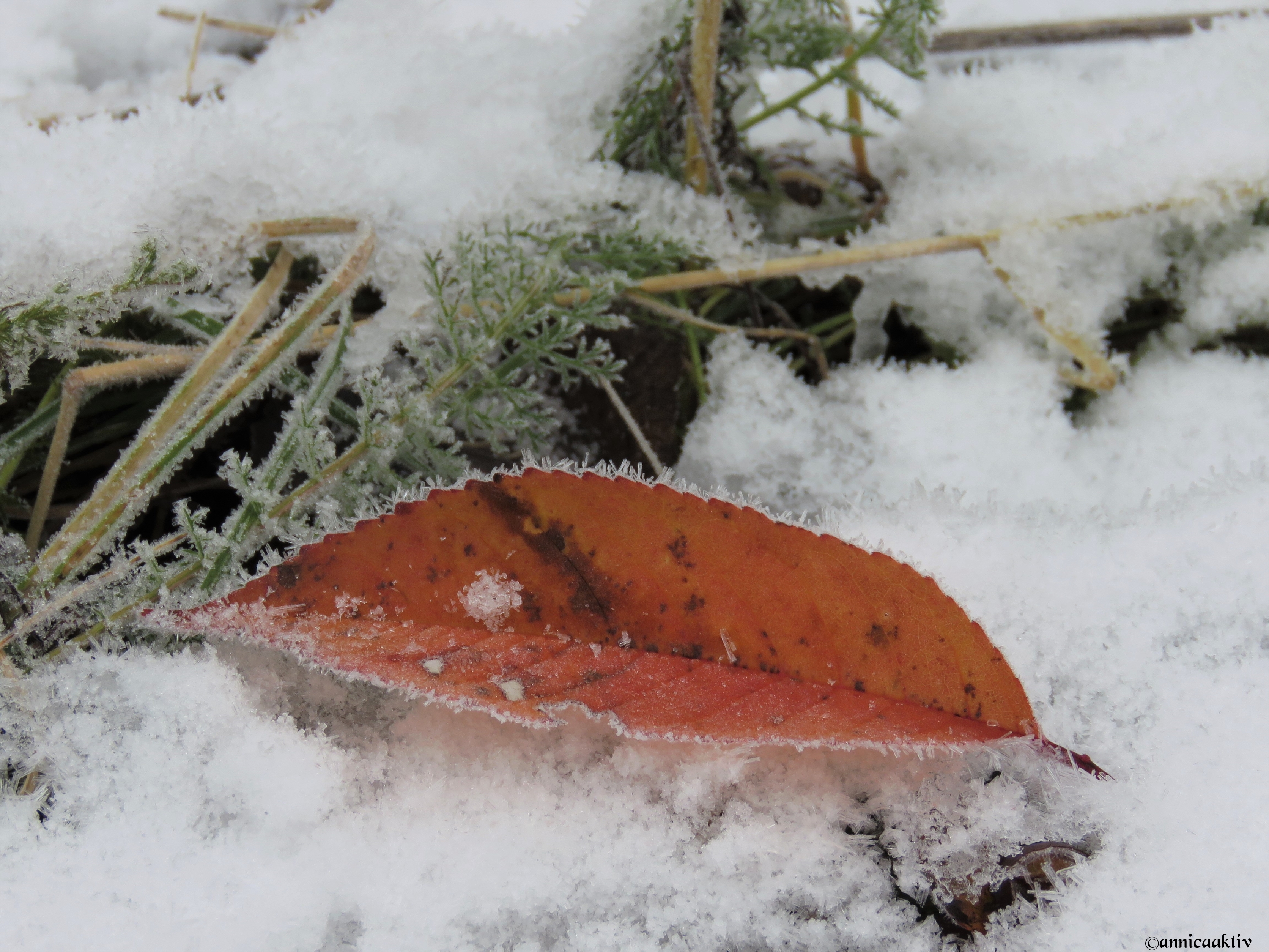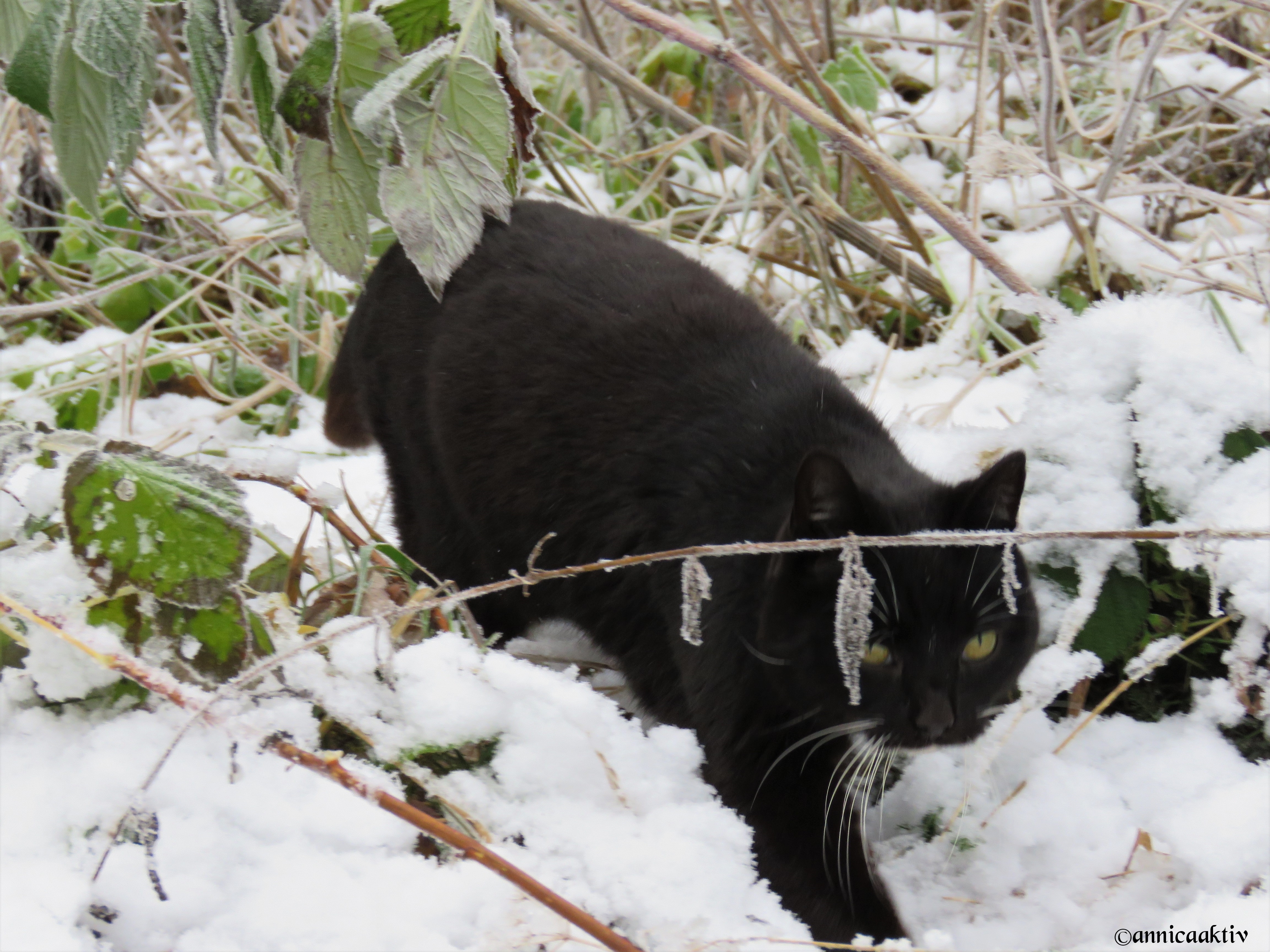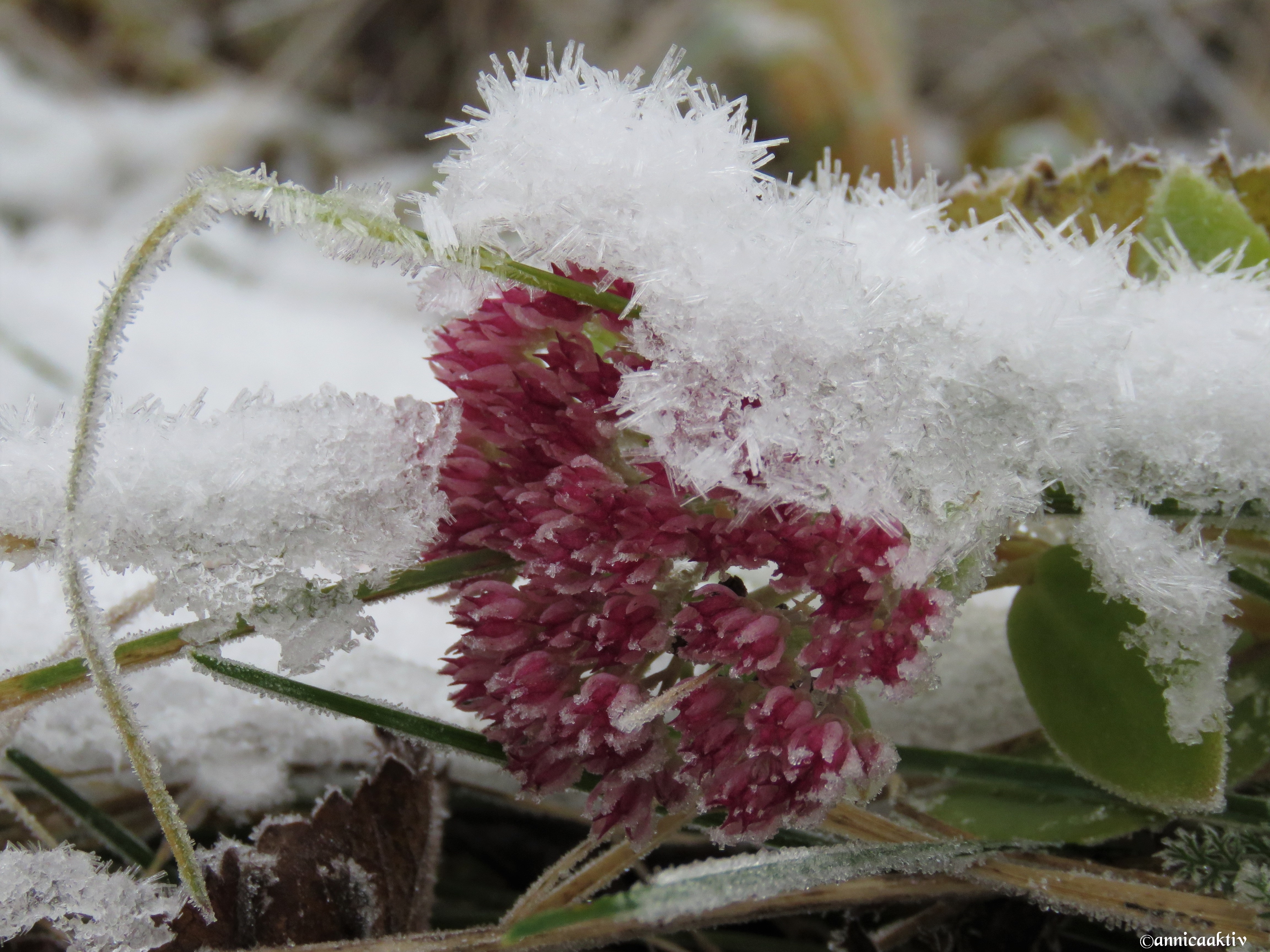 Snö, is, blommor, blad och katten på slutet. Kylan kommer med stormsteg nu och ombonar naturen med sin mjuka bomull. Katten skulle prompt vara med på sista bilden. Hon påminner om en geisha med smycken på sina kinder.