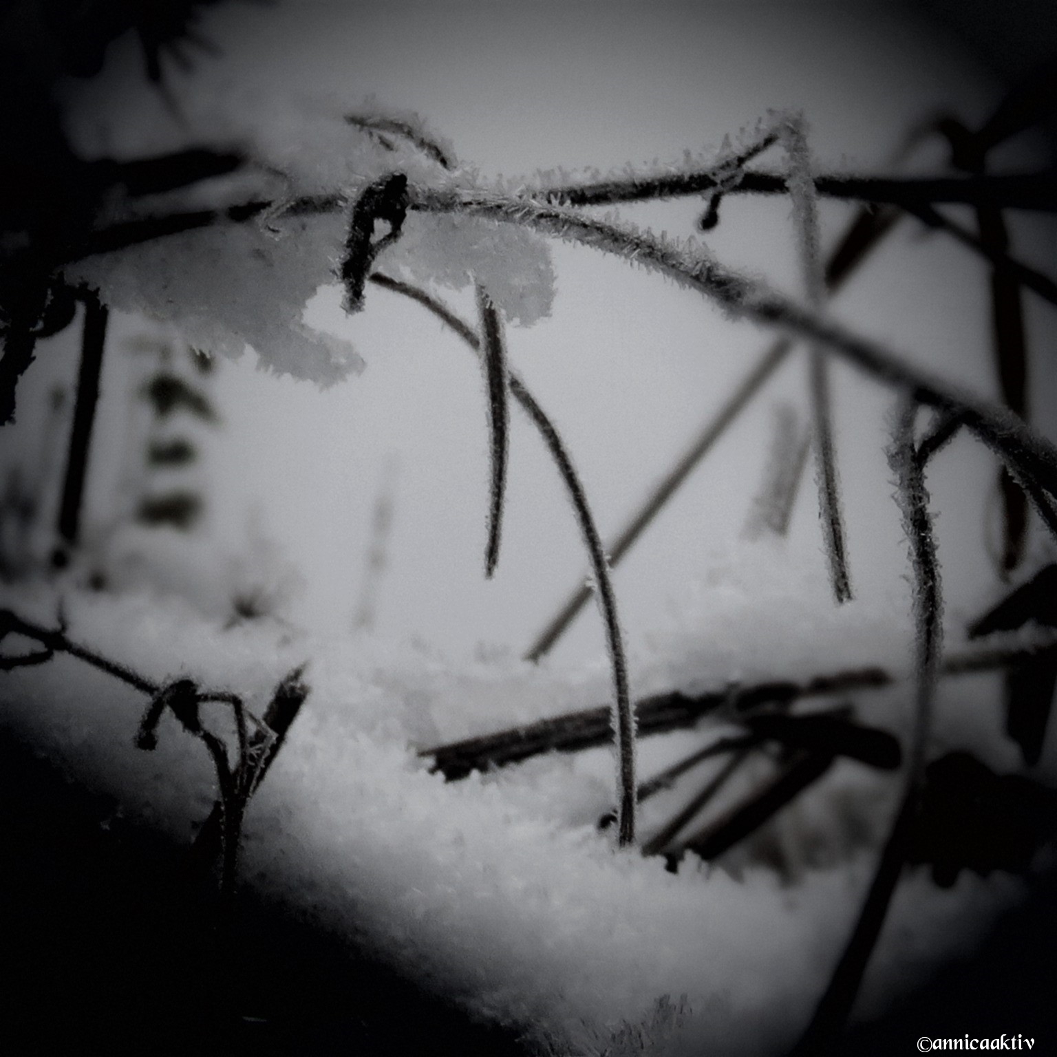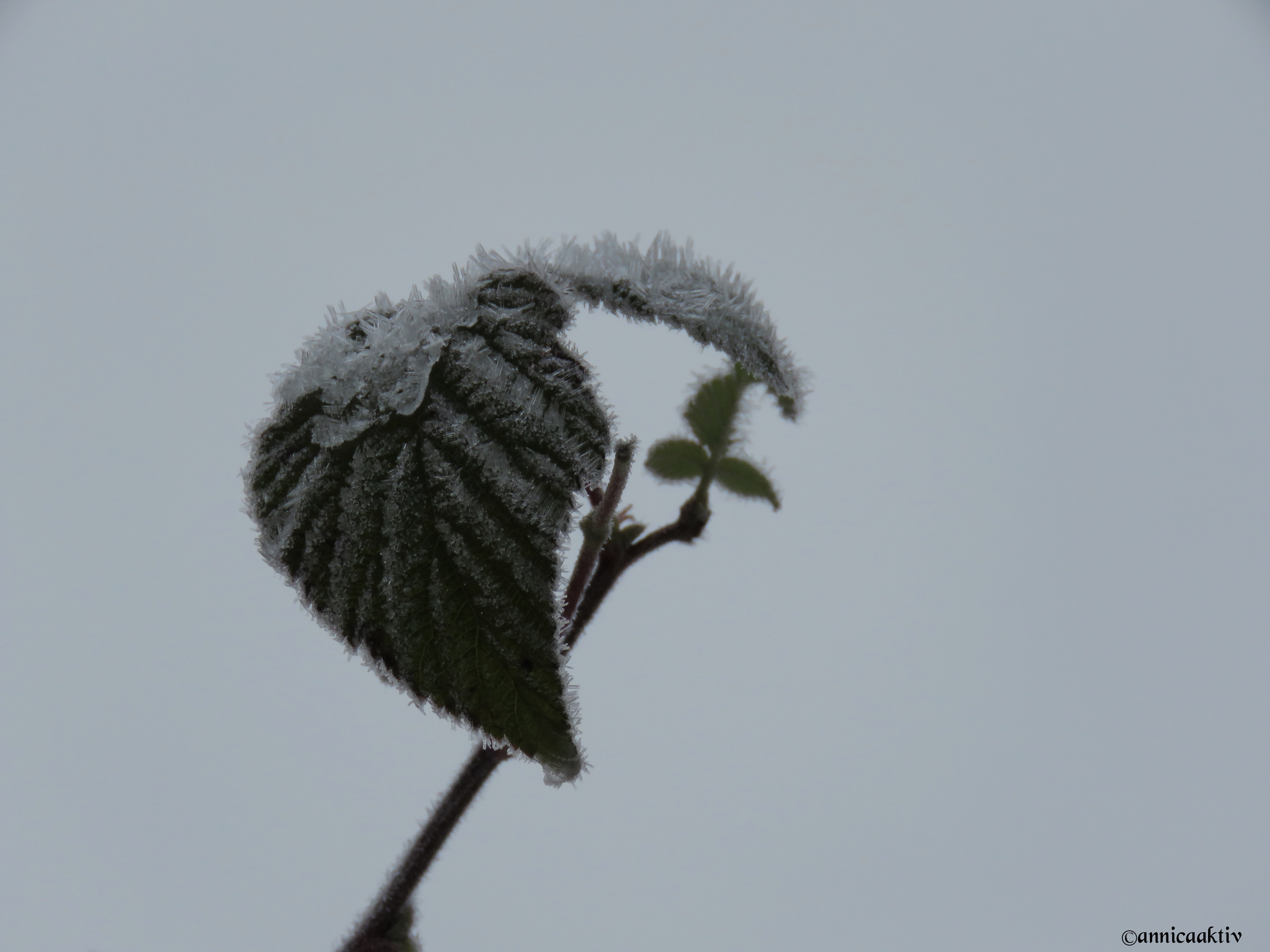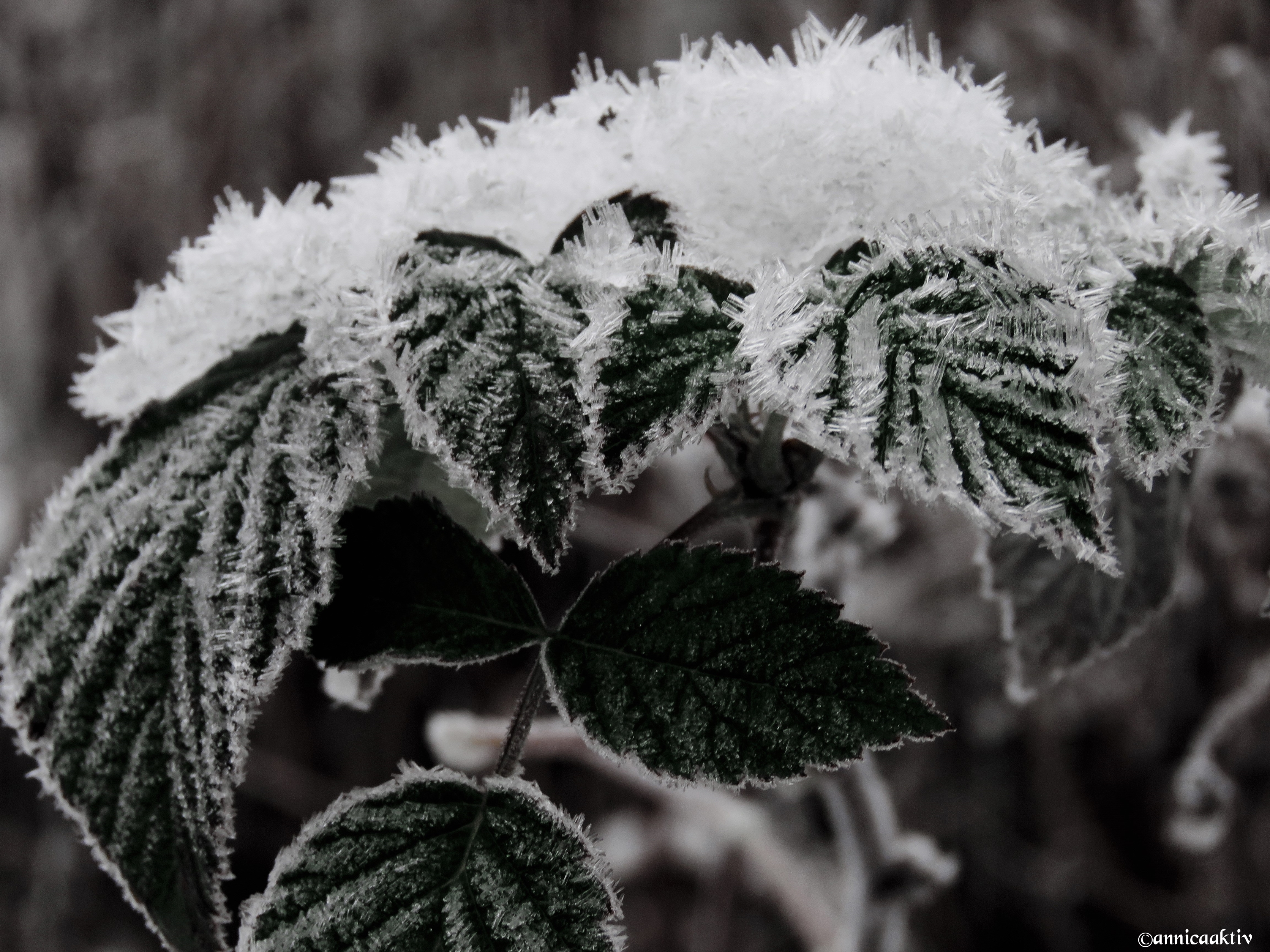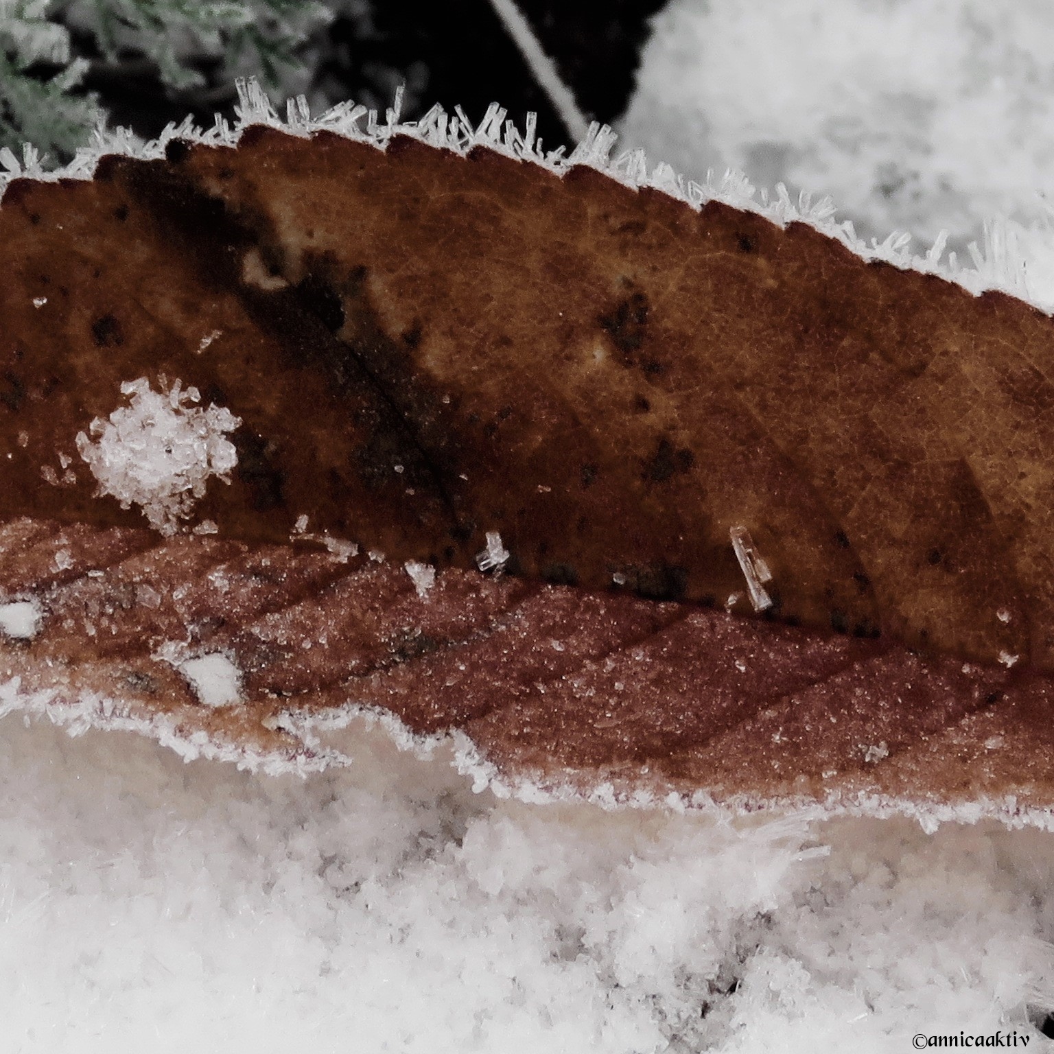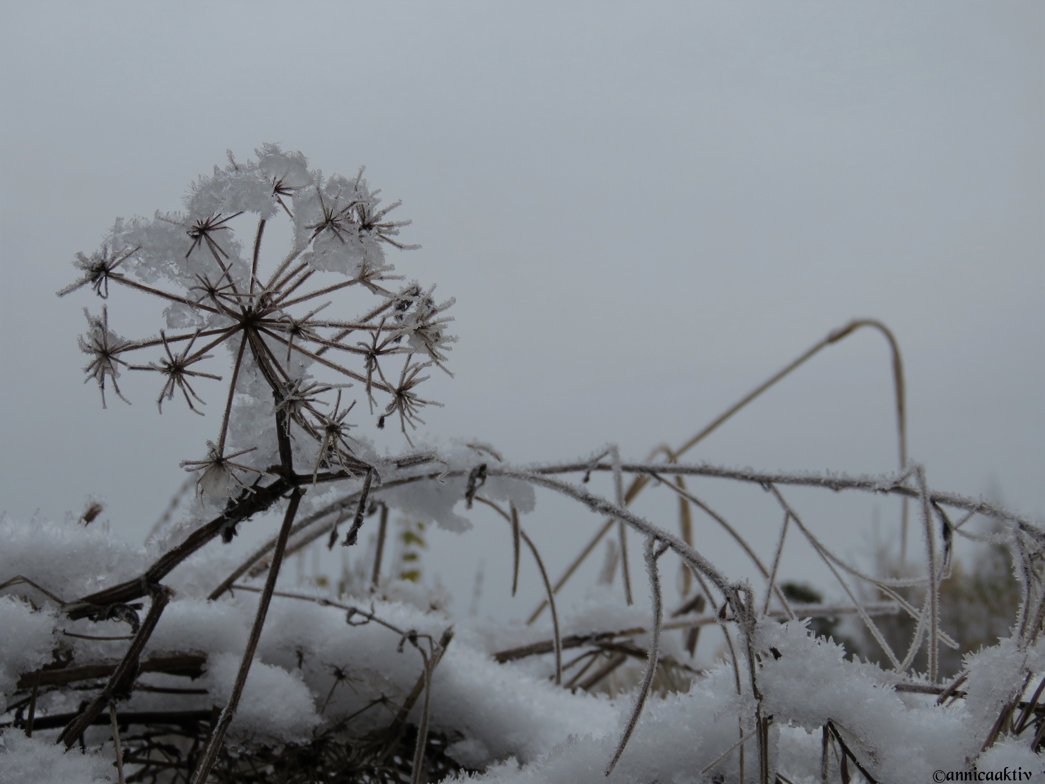 Snö, is, blommor, blad och katten på slutet. Kylan kommer med stormsteg nu och ombonar naturen med sin mjuka bomull. Katten skulle prompt vara med på sista bilden. Hon påminner om en geisha med smycken på sina kinder.