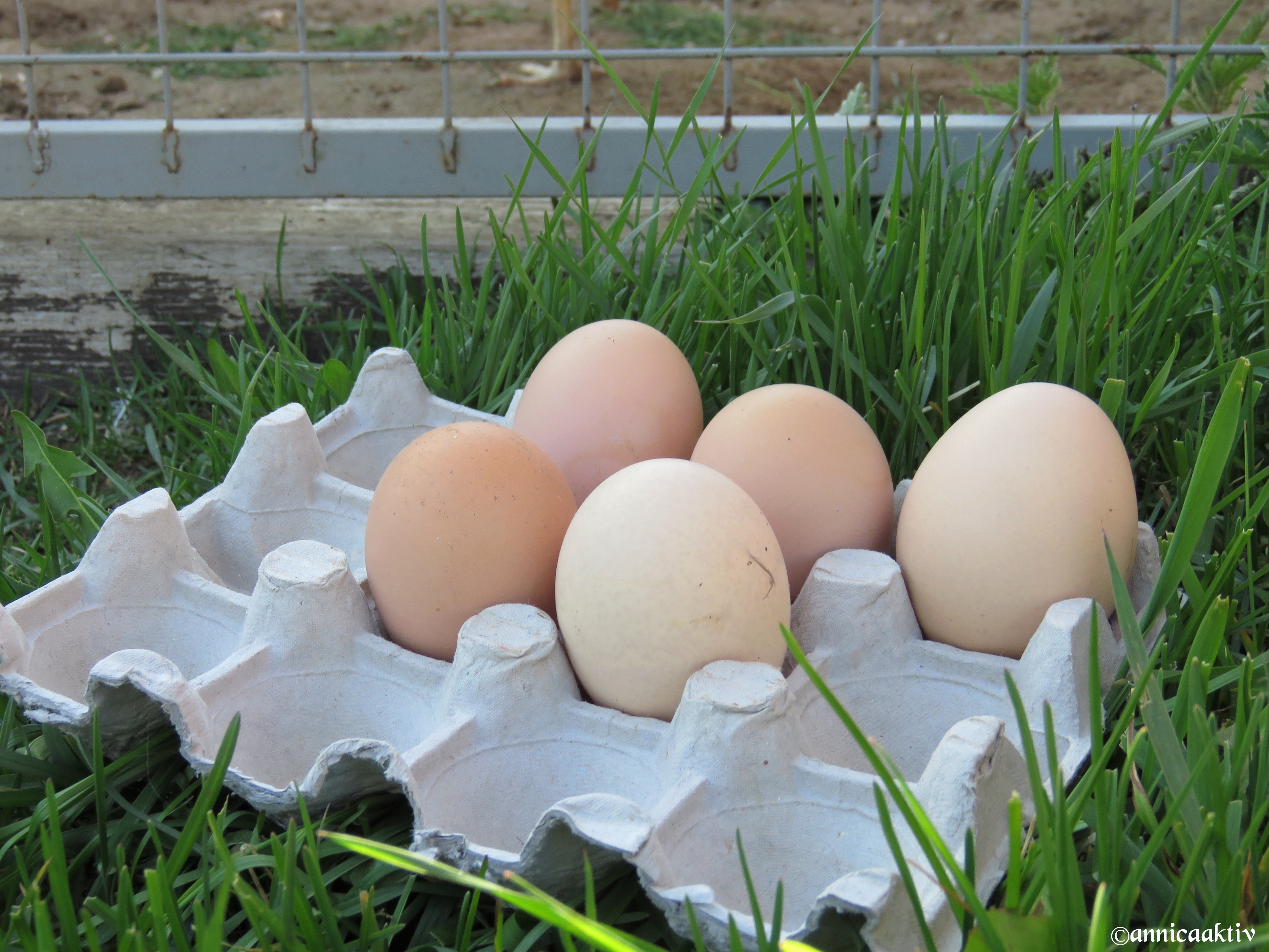 Åh dessa underbart goda och vackra ägg! Jag har två hönor som är ett år gamla och dom lägger ett ägg per dag ungefär. Men i dag, just i dag, så har en av mina kycklingar lagt sitt allra första ägg, det är en stor lycka här hos mig. Det första ägget är inte slätt och perfekt, men vad gör väl det, ett ägg är ett ägg 🙂 Jag tror att det kan vara den gråa kycklingen som är lite äldre än dom andra kycklingarna. Hur som helst, så säger jag…. Tack för ägget! 🙂