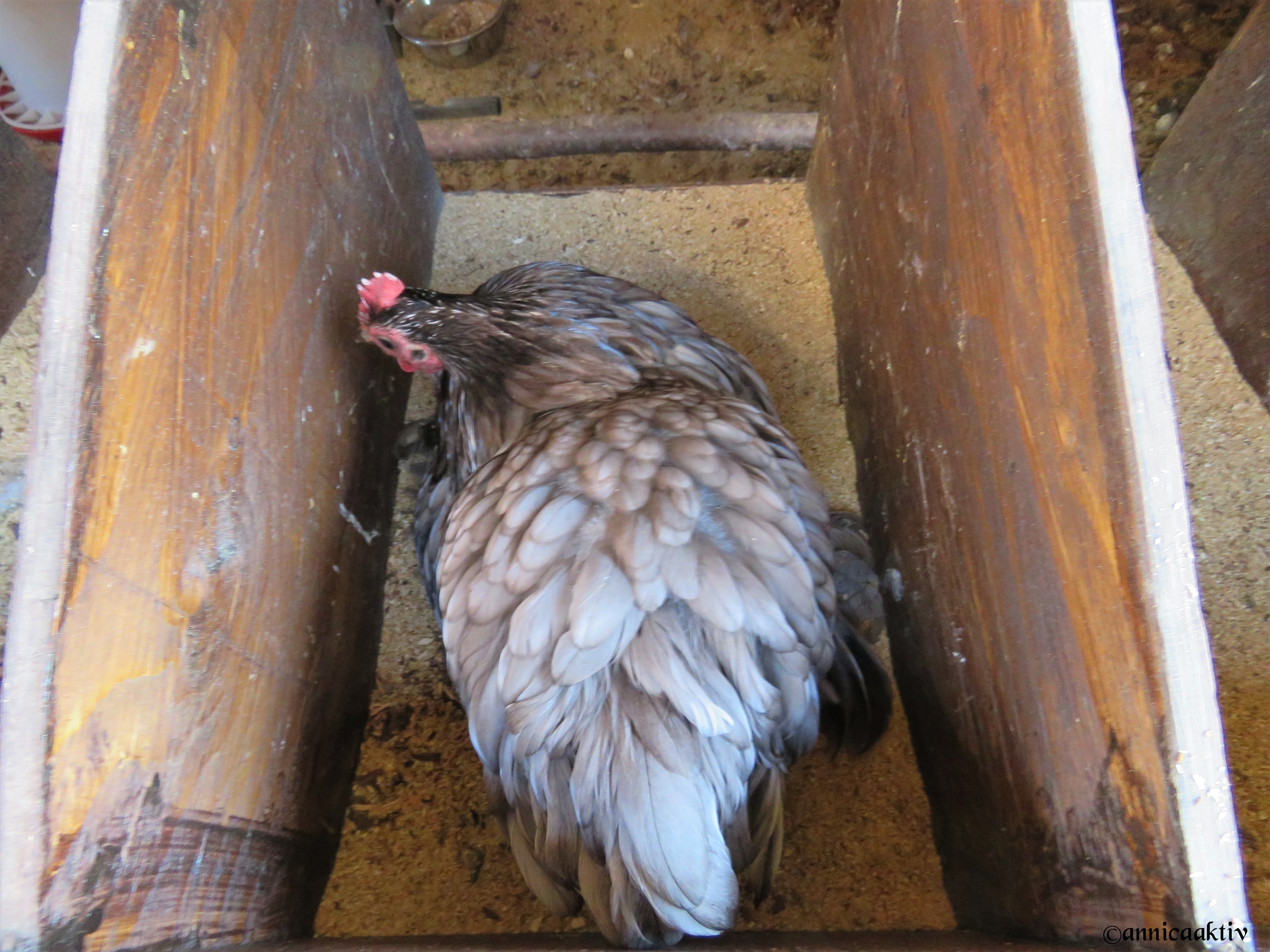 Nu när nätet över hönsgården har gått sönder, ja då passar både kycklingar och hönor på att sova ute under bar himmel. I normala fall så brukar de vilja övernatta i hönshuset på nattpinnarna, men inte dessa figurer. Det är bara en höna, som varje natt sover i hönshuset, dom andra ska sova på ramen på hönsgården. Jag är ju lite orolig att nån rovfågel eller räv ska slinka förbi, innan vi hinner göra ett nytt skydd över hönsgården. Det skulle vara synd, dels för att jag tycker om mina fjäderfän men också för att några av dem har blivit vuxna och värper så bra just nu. Att varje dag få gå ut i hönsgården och plocka in färska ägg, det är livet det. Det blir man aldrig för vuxen för 🙂 Klicka gärna på bilderna för att göra dem större.