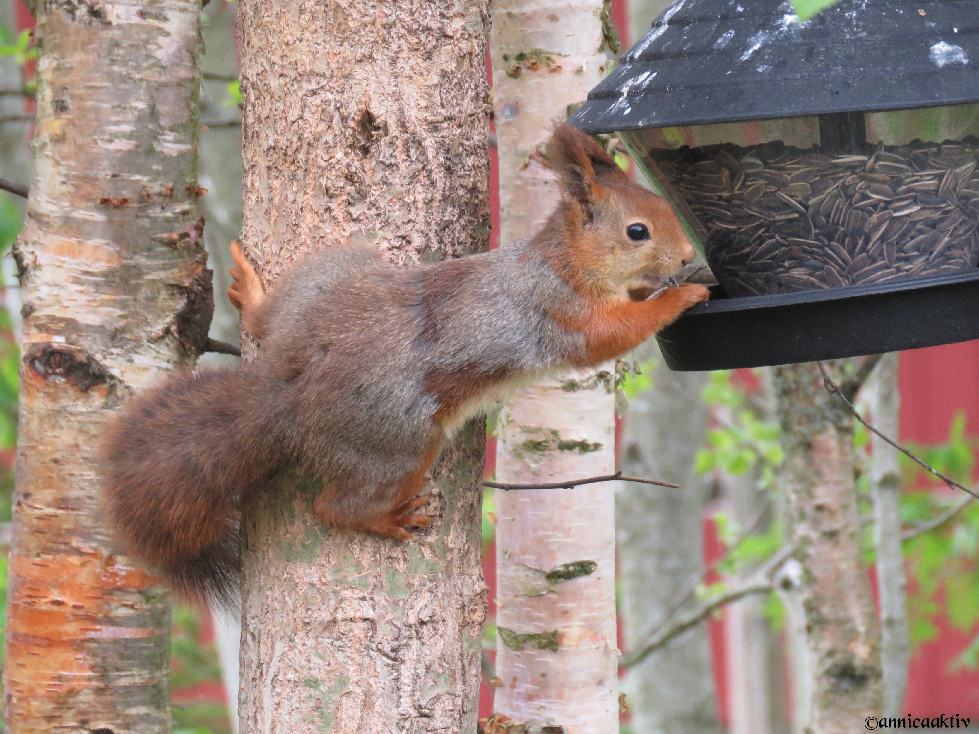 Flera matgäster hälsar gärna på nu när det är snö och kallt. Den lyxiga ekorren, den vackra hackspetten, alla fina småfåglar och katten som trampar på utanför balkongdörren ute i snön och bara vill in i värmen. En måste väl ändå säga, det är vackert med snö.
